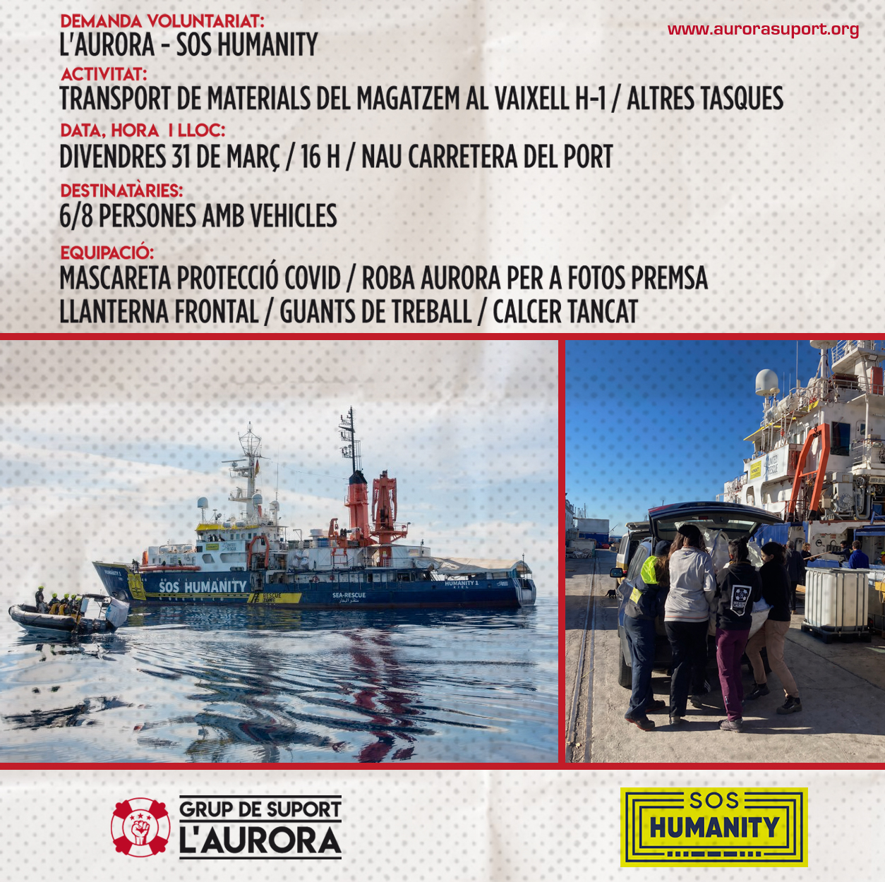 Durant la passada setmana, vam activar el grup de voluntariat de L’Aurora i el divendres 31 de març vam dur a terme l’acció. Un grup de 10 voluntàries de l’Aurora vam acudir a la crida, coordinades amb l’equip de SOS Humanity vam desplaçar tots els materials fins al vaixell. Es van organitzar viatges amb els 7 vehicles disponibles. Junt amb la tripulació i voluntàries de l’entitat alemanya es va pujar tot a bord.